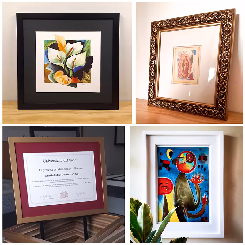 Enmarcado sencillo donde la obra va pegada directamente al marco, ideal para proteger y exhibir sin elementos adicionales.