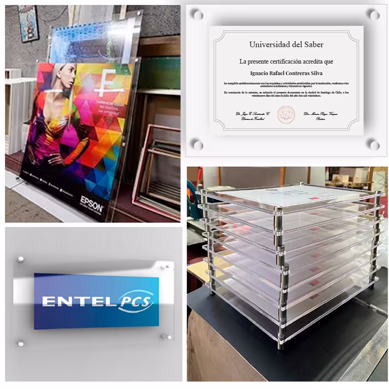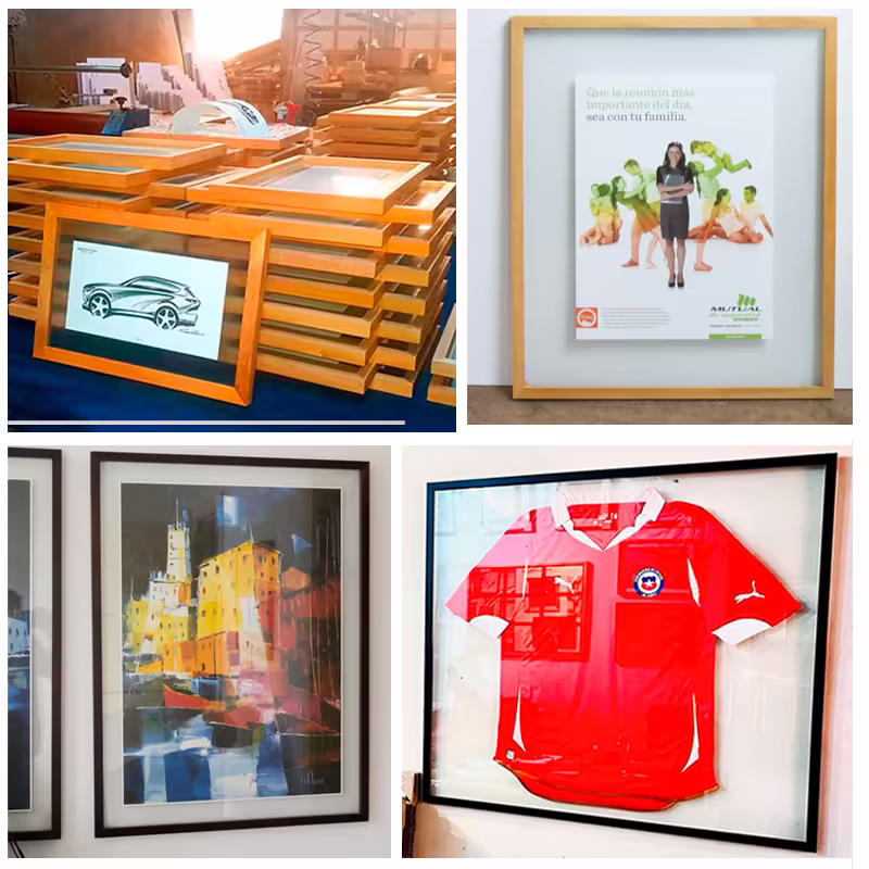 Utiliza dos acrílicos para proteger y destacar la obra, aportando ligereza y un diseño contemporáneo.